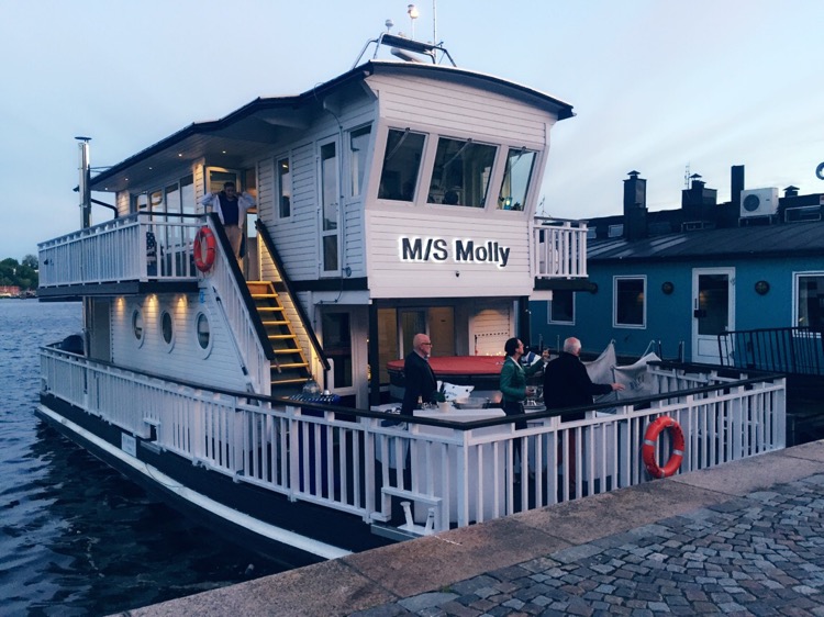 Utan att veta något har vi lastat oss ombord på båten MS Molly nere vid strandvägskajen och helt oförberedd kommer Simon men Camilla till båten och överraskad av vänner och sång.  Camilla Läckberg kan hitta på roliga saker och överaska hon!  Vilken mysig kväll det blev med god mat dricka och en tur runt Sthlm på vattnet ihop med sköna trevliga människor.