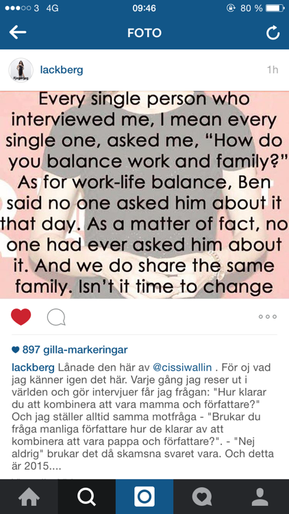 Jag gillar dra parareller eller rättare sagt ser likheter mellan helt olika ämnen men som kan jag ser likheter i. Ex en mamma går på arbetsintervjuv och kommer i 9 fall av 10 få frågan på hur hon klarar av att hämta på dagis, om barnen blir sjuka etc etc… Mammor får då alltid va redo på försvar och har dom en man (pappa) till barnen hemma måste den användas som skydds Sköld, som försvar att de klarar arbeta vilket är sinnes. Varför ska kvinnor alltid få denna fråga mer än män? Kvinnor som har karriär får denna fråga ofta och ta tex Camilla Läckberg som idag delade en status på sin instagram som Cicci Wallin delade innan, om att kvinnor alltid får denna fråga. Camilla tex får frågan hur hon hinner ha karriär samt vara mamma. Jag ser att den karriärer är fördel för barnen trots resande på bokmässor mm viktigt. Oavsett karriär är det förbaskat tröttsamt att kvinnan ses som huvudansvaret i familjelivet, vi pappor då? Ska inte va frågas samma? Vi är också där som föräldrar och vabbar också tex trots karriär. Det är upp till familjen själva att styra det.