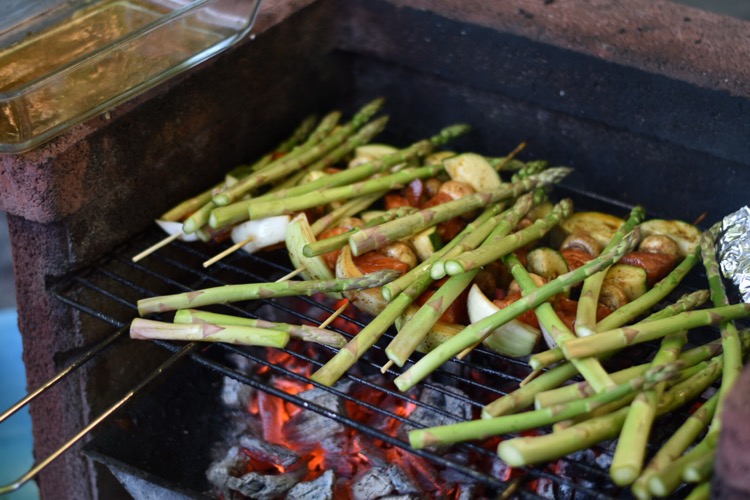 Gott med grillad laxspett och en krämig Sås av rom och dill.