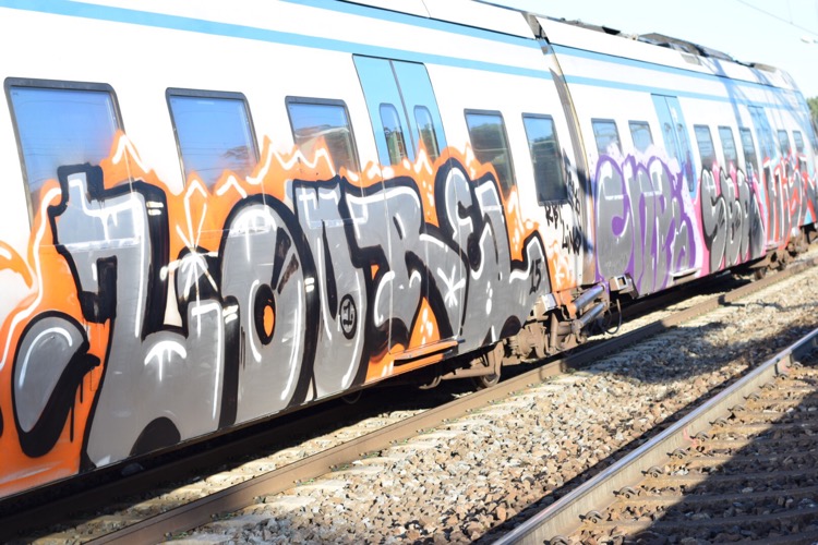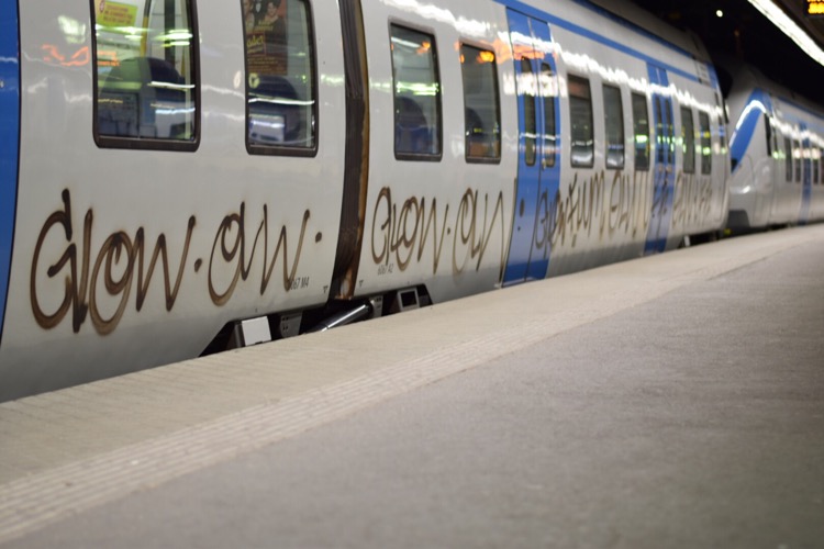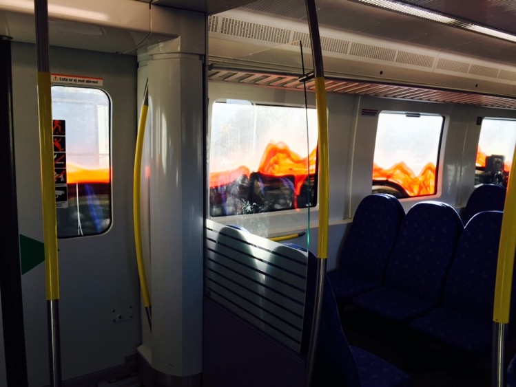 Nu sitter jag i den delen av tåget det inte är målat men ändå är stanken från färgen så stark att den följer med överallt. Jag tvingas nu sitta här och kommer må efter det också precis som alla stackars resenärer. Just där dom klottrat som värst, är den delen där barnvagnar ska stå tex och jag lider med alla små stackare som måste andas in ångorna. Var är den fina charmen i detta?