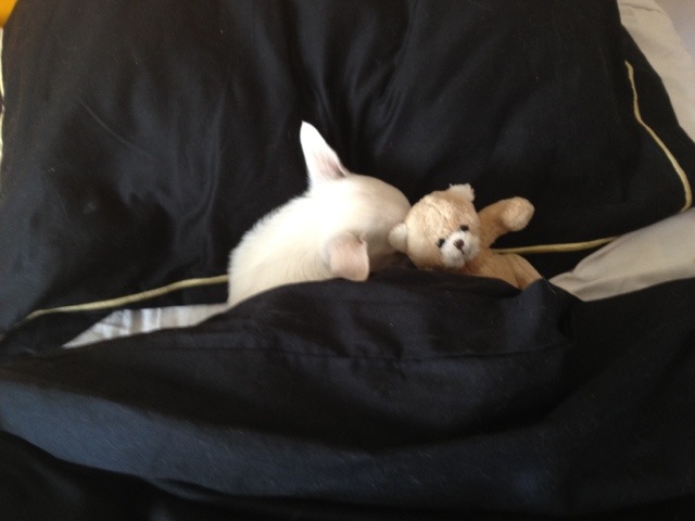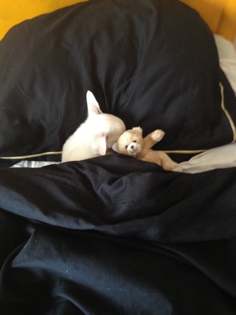 Jag och Vanessa var ute på en lång promenad igår i 2 timmar med Valentino, så han sov som en stock hela natten, imorse gick vi också en lång promenad , så nu ligger han i min säng med sin nalle och sover!