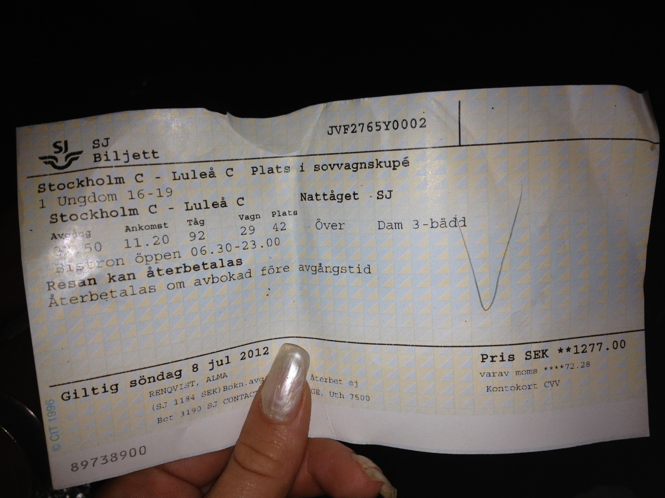 1300:- för tåg till Luleå enkel ungdom. Det var dyrt!