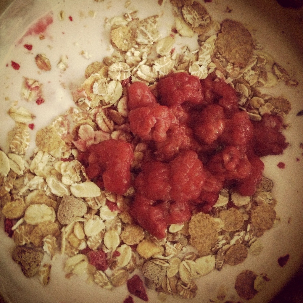 RECEPT; Lättkesella med funlight och lite vatten som jag blandar ihop, sedan toppat med müsli och färska hallon! YUMI!