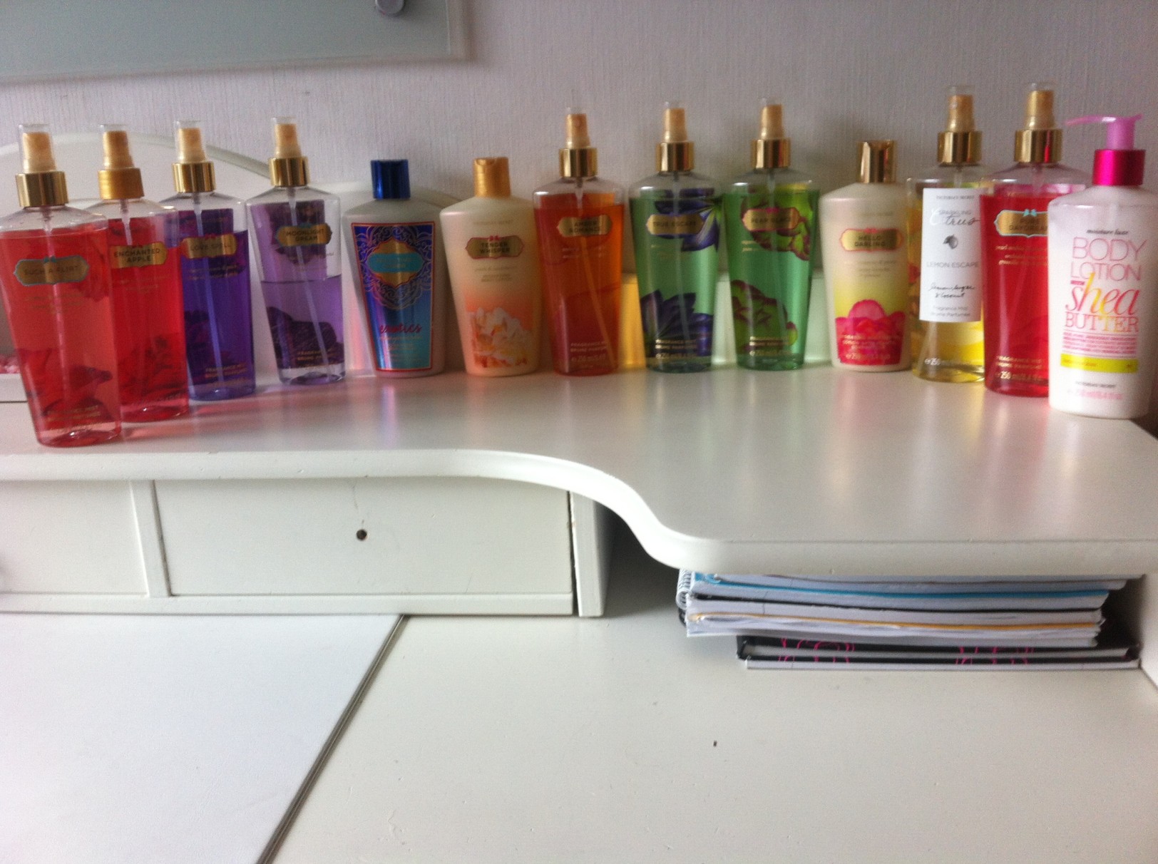 Mina body lotion i Victoria Secret är Shea Butter, Hello Darling, Tender Whisper och Seductive Amber. Sen är mina body mist i Victoria Secret är Pure Daydream, Citrus, Pear Glacé, True Escape, Amber Romance, Moonlight Dream, Love Spell, Enchanted Apple och Such A Flirt.