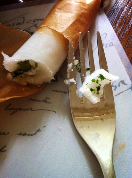Bred ut kokosfett eller olivolja på ett bakplåtspapper, ca 0,5 cm högt och 1 kvadratdecimeter. Pressa över 4-6 vitlöksklyftor. Strö över lite flingsalt och alternativt ca 1 msk färsk persilja. Rulla ihop och förvara i frysen, ta fram en stund innan.