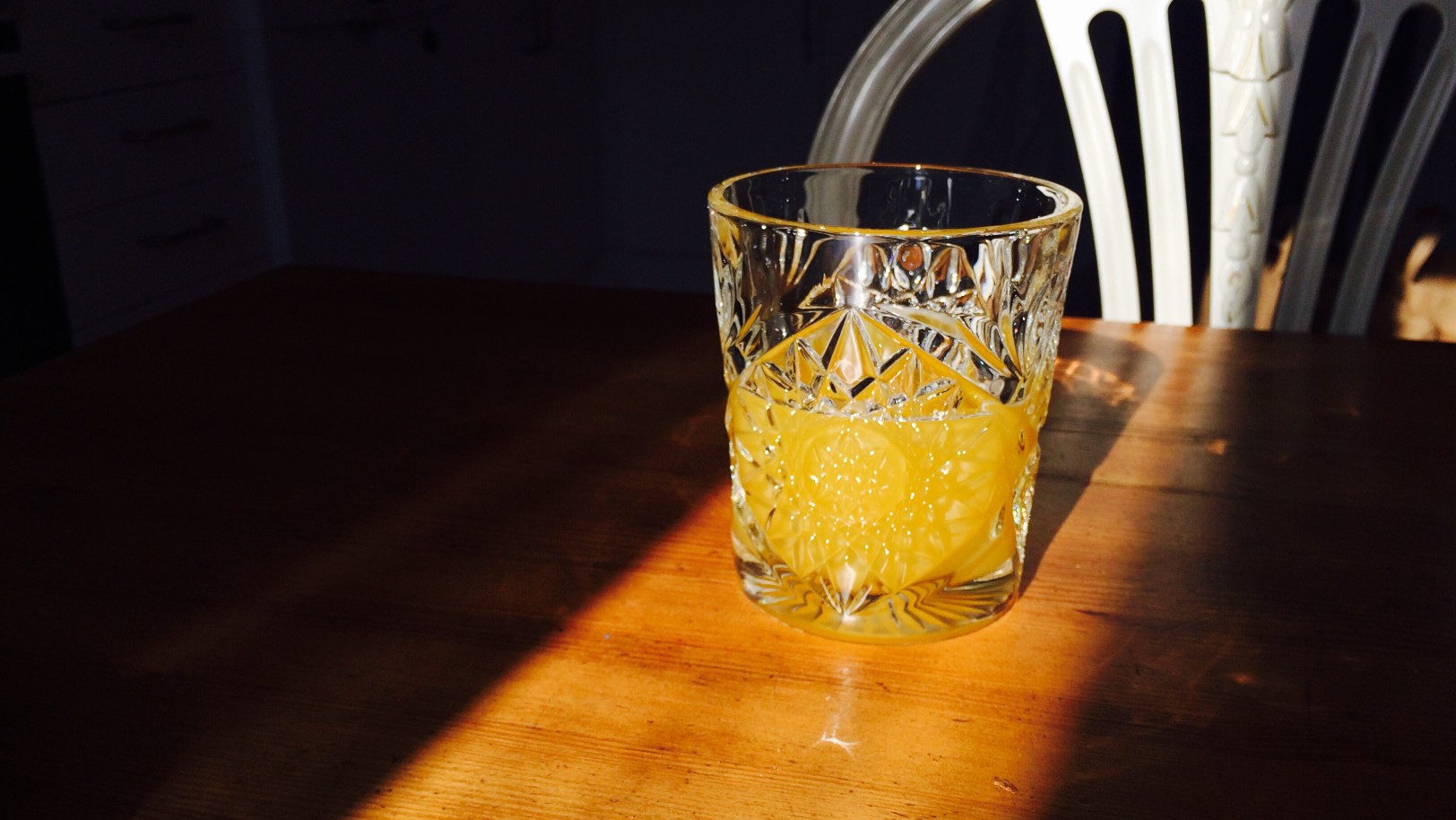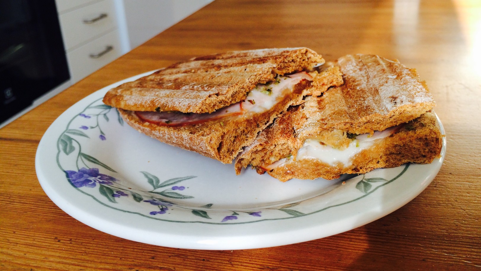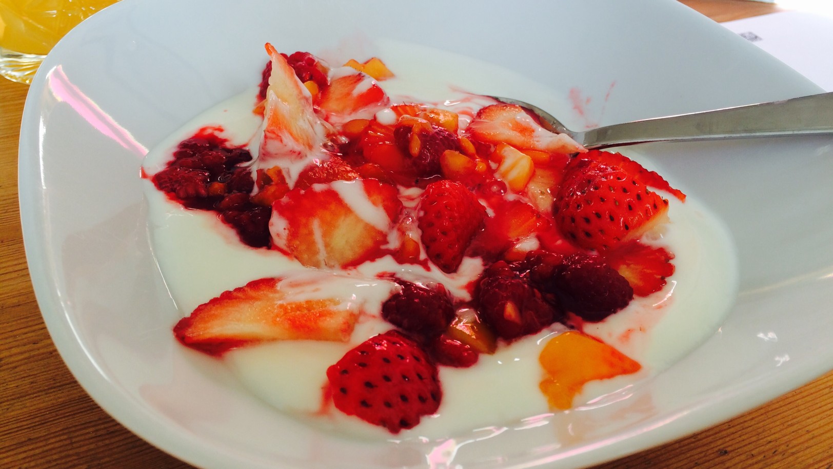 Det är en surdegsciabatta med mozzarella, skinka och oregano, grillad i en smörgåsgrill. Sedan har vi honungsyoghurt med jordgubbar, hallon och mango. Och juicen är Bravos exotiska 🙂