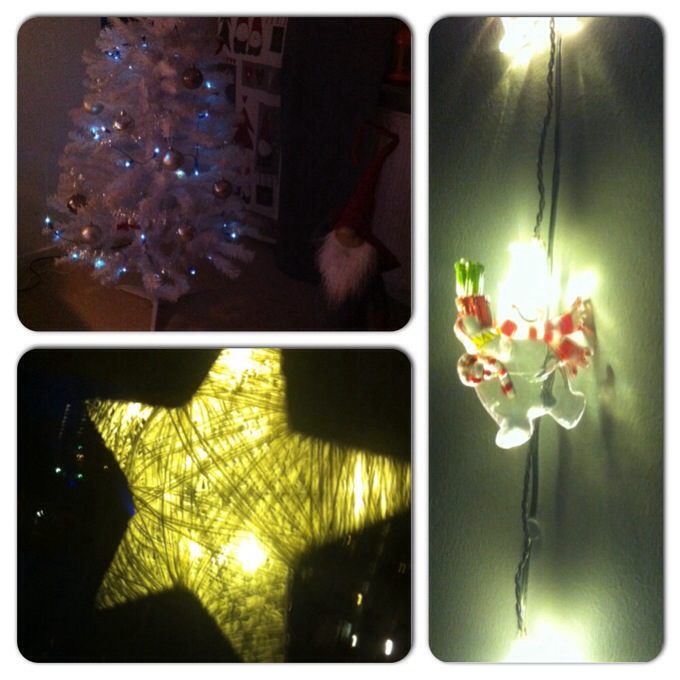 Idag tog vi upp Caspers gran på hans rum och pyntade den, snögubbelamporna fick en plats på väggen.