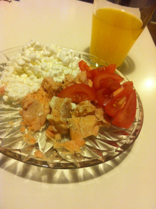 Mat! 23 december 2013 av angiee Dagens allra första måltid består utav ugnsstekt lax med lätt keso, en tomat och ett glad Fanta Zero.
