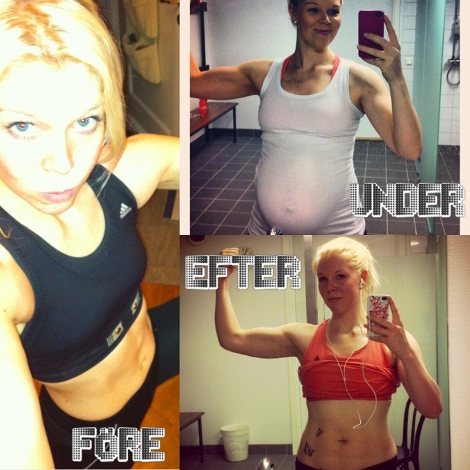 Måste lägga till före bilden är December 2011, under är vecka 30 i graviditeten och efter var igår 9 veckor efter förlossningen. Känner mig jätte nöjd med förändringen på den lilla tiden. Grov jobbet är gjort bara finliret kvar. Mer muskler, lite mindre fettprocent och tighta till lite.