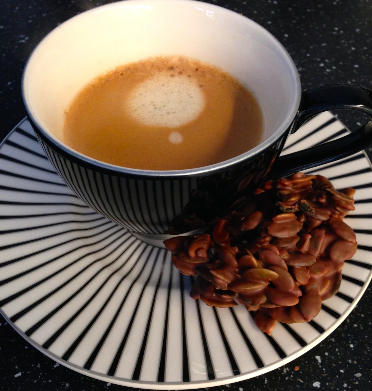 Passar på att fika också. Chokladdoppade pumpakärnor och finkaffe = njuta av livet.