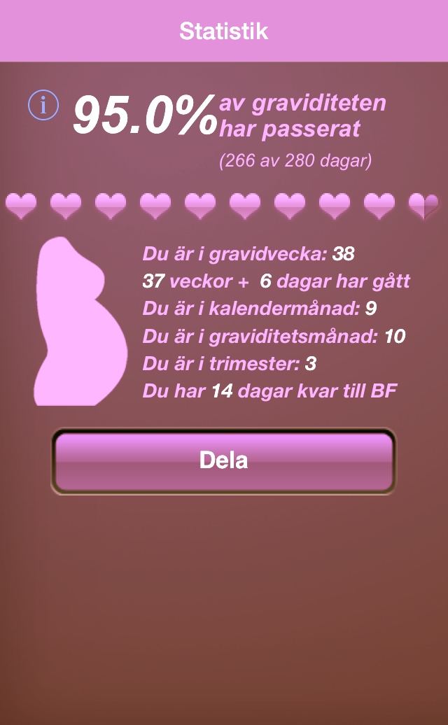 Börjar ledsna ur mer och mer. Humöret svänger och det börjar göra riktigt ont i höfterna pga att de bara blir mer och mer instabila. Detta är dock inget dåligt inför förlossningen, tvärtom så gör det att hela förlossningen blir lättare men det gör förbaskat ont nu innan istället. Dock så känns det lite som om jag inte får klaga eftersom jag kommit så otrolig lindrigt undan denna graviditet. 95% av graviditeten avklarad och jag börjar få ont nu.