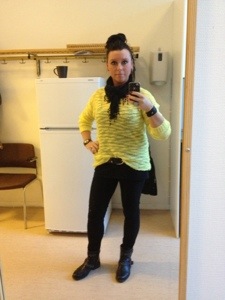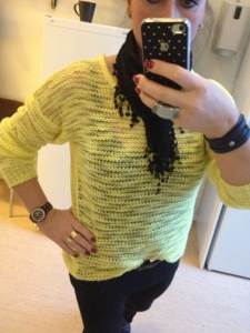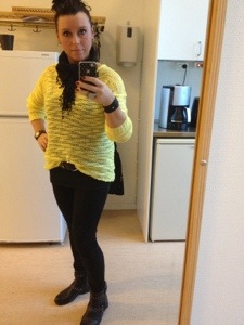 Dagens outfit är inte precis den ni förväntar er att se mej i skulle jag tro, i alla fall inget mina vänner och bekanta förväntar sej att se mej i i alla fall.. Haha…. Jag har alltid sagt att gult är inget för mej, jag tycker inte in gult, det är fint på andra osv… Och vad händer??? Jo just precis… det oväntade händer… Jag har faktiskt gult på mej i dag… Fråga mej inte varför det blev så för jag vet ärligt talat inte vad som hände.. jag fick ett sånt där infall som jag kan få någon gång då och då… Och hör och häpnad, jag trivs jätte bra i min nya stickade tröja från märket Serious Sally..
