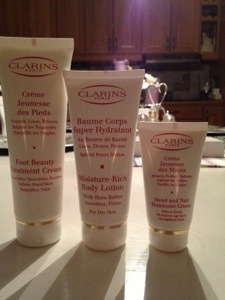Body lotion, foot cream och Hand and Nail treatment… Och den bodylotionen från clarins smörjde jag mej med igår efter dusch och idag innan jobbet… Luktar Fab och du behöver ingen parfym.. Hade med mej både hand creamen och body lotionen på jobbet i dag och smörjde på lite extra på lunchen för att fräscha upp doften…kan verkligen rekommenderas…