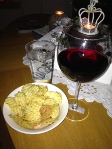 Per väljer ett glas rött, dillchips och lite vatten..