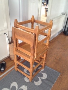 Sen tog jag in en gungstol och satte i ena hörnet också den har stått på logen länge… Rummet är ganska svårmublerat med snedtak på båda sidor så vi får se hur det blir när det blir klart.. Jag skall även få plats med en låg bänk som jag kan förvara lite saker i innan det blir klart, även den behöver fräschas upp med lite ny vitfärg och så ska jag nog byta knoppar på den.