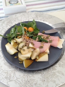 En skinkskiva som jag delade i två och rullade in en skiva Brieost i vardera och till det lite bladspenat, lite ruccola, solrosfrön, pumpafrön, ett halvt päron och lite physalis.. Vatten och en kopp kaffe till det….mums mums och nu kommer jag stå mej ända fram till middagen…