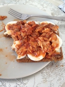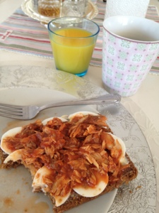 Tvättmaskinen är laddad med en svarttvätt och jag känner mej mätt, nöjd och belåten.. Jag har nyss ätit frukost och jag lyxade till det med äggmakrill mackor.. 2 ägg, 1 makrillburk och 2 skivor Danskt rågbröd… 1 stor kopp pressokaffe och sist men inte minst ett glas jätteonyttig bravo apelsinjuice…