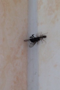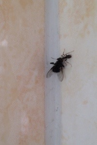Men kolla hur den lilla myran släpar en stor och tung fluga efter badrumsväggen..