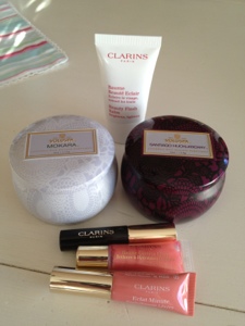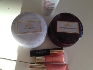 Alltså!! Bara en massa favoriter, älskar lipgloss och clarins lipgloss gillar jag jättemycket… Och så TVÅ burkar doftljus från Voluspa… Wow, vilket lyx!! Älskar också Voluspas doftljus… Mascaran är en sån där liten perfekt att ha med sej i väskan..och krämen har jag inte riktigt kommit underfund med vad det är än, någon slags kräm att smörja utan att gnussa in i huden och snabbt på med make-upen? Hmmm!!! Jag blev så himla glad i alla fall… Bäst av allt att jag helt hade glömt bort att jag skulle få dessa saker..