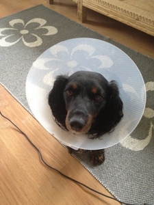 Ringde veterinären tidigt i morse och fick en tid 14.30 idag.. Hilda har hållit på slicka sej på sina klinkor några dagar och när jag tittade så såg jag att det var svullet och det kom var ur ett litet sår… Nu är det äntligen fixat och hon fick smärtstillande som hon skall få äta i tre dagar samt en mindre rolig sak… Tratten!!!…