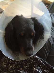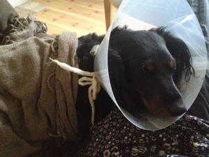 Hon ser ju för ynklig ut i sin tratt stackr’n…och nu har vi kommit tillbaka hem efter en promenad och så somnade hon helt slut mot mitt knä..