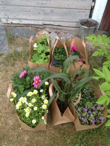Regnigt och kallt som alltid när jag bestämmer mej för att börja plantera.. Fördelen är ju att jag inte behöver vattna så mycket.. Jag köpte även 7 olika sorters perenner som jag har planterar i naturträdgården som vi kallar det.. Där får blommor och högt gräs växa vilt..