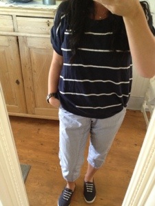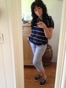 Den blå toppen med vita ränder är i märket Boomerang och också den har några år på nacken… Dom vit/blå randiga byxorna är hör och häpnad i märket Brandtex.. Inte det första märket man kanske tänker på när det gäller mej. Men så är det också det endera plagget jag har i det märket.. Också dom är flera år gamla.. Man behöver inte alltid ha på sej det som är nytt.. Är man rädd om kläderna så håller dom länge..
