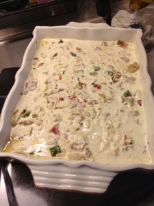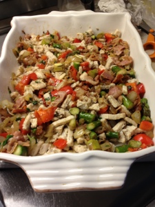 Här har jag brynt 4 kycklingfiléer och lagt i botten i formen, jag har brynt på röd paprika, gul lök och sparris som är saltad och pepprad. Sist stekte jag på bacon och blandade dom med grönsakerna som sedan blandades med den brynta kycklingen.. Sist blandade jag grädde, färsk basilika, färsk timjan, sambal olek, chilipulver, salt, peppar och riven västerbottenost, hällde det i formen..