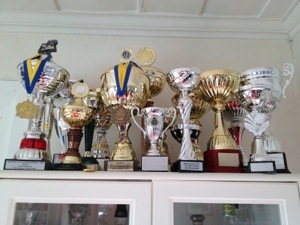 Det börjar bli tjockt ovanpå skåpet nu för alla priser.. Vet inte riktigt vart jag skall ställa dom längre.. Tycker inte om det som det är nu..Bäst vore om han ställde dom i garaget på någon hylla där, men det förslaget verkar inte vara så populärt.. Haha..