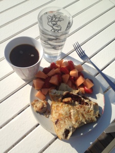 20130701-085411.jpg Bananpannkaka, meloner och jordgubbar, kaffe och