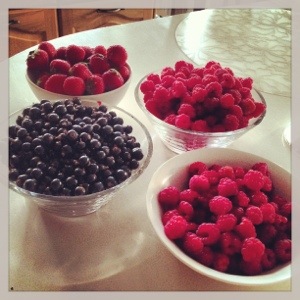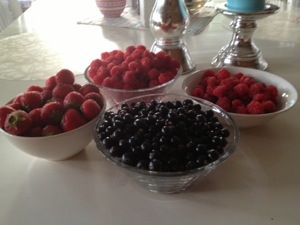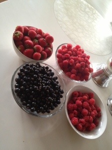 Trädgårdshallon, svartvinbär och jordgubbar.. Längtar tills i morgon när jag skall göra nåt riktigt gott av detta… Nu skall jag ta och softa lite i soffan i den sköna sommarvärmen.. Per är i Tierp i helgen och tävlar så håll tummarna alla att det går bra.. Går han vara vidare några rundor så har han hunnit årets SM.