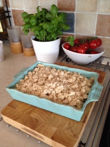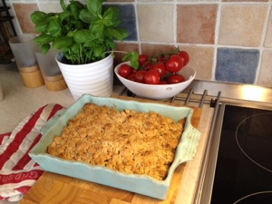 - Blanda ingredienserna till degen till en smulig deg och strö över frukten i en pajform.