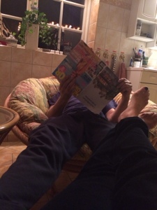 Ja här sitter vi i varsin fåtölj, den ene sitter och filosoferar och den andra sitter och läser om resor och drömmer sej bort till varmare land..