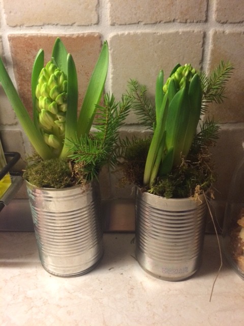 Att plantera hyacinter i gamla konservburkar är både fint och framförallt billigt.