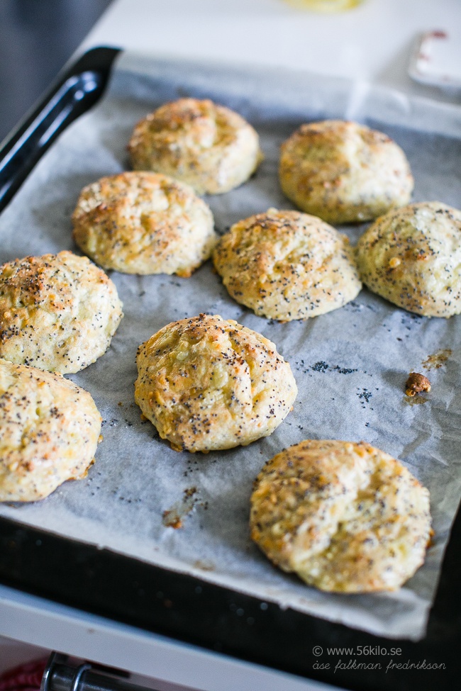 Ingredienser 1.4 ägg 2.100 gr naturell färskost (Philadelphiaost) 3.	1,5 msk psylliumfröskal (Fiberhusk) 4.	2 tsk bakpulver 5.	2 msk chiafrön 6.	5 dl riven ost (Jag hade 29% riven Gouda) 7.	Toppa med: svarta vallmofrön + lite havssalt Instruktioner 1.	Sätt ugnen på 200 g. 2.	Vispa äggen riktigt fluffiga, ca 5 minuter. 3.	Blanda de torra ingredienserna. Vispa ner färskosten och de torra ingredienserna. 4.	Låt stå och svälla i ca 10 minuter. 5.	Klicka ut 10 höga smetbollar på bakpappersklädd plåt och sätt in mitt i ugnen i ca 10-15 minuter tills de fått fin färg utan att bli brända. Låt svalna en stund innan servering.