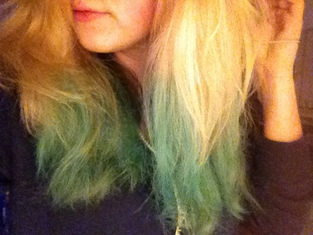 Bestämde mig för att fixa dipdye idag, det skulle bli blått… Men beroende på ljuset så är det aningen grönt… Kul iaf med lite ändring! 😀 dock är det ju fixat med karamellfärg som betyder att de försvinner om ett par tvättar + att det är väldigt klottrigt att göra den! :S Men är väll nöjd med resultatet och rockar den med one piece just nu… xD