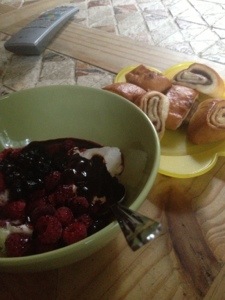 Börjar min morgon med en sjuk frulle Haha glass och gifflar åh gott! Nu ligger jag hör på soffan helt utslagen , mår verkligen piss!