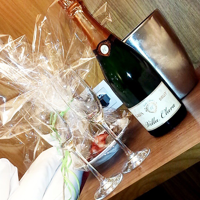 var och köpte med middag som vi åt på hotellet, det ligger ju precis vid centrum så vi gick en sväng. efter det beställde jag upp en flaska cava och ett fat med riktigt färska och goda jordgubbar samt choklad som vi unnade oss.