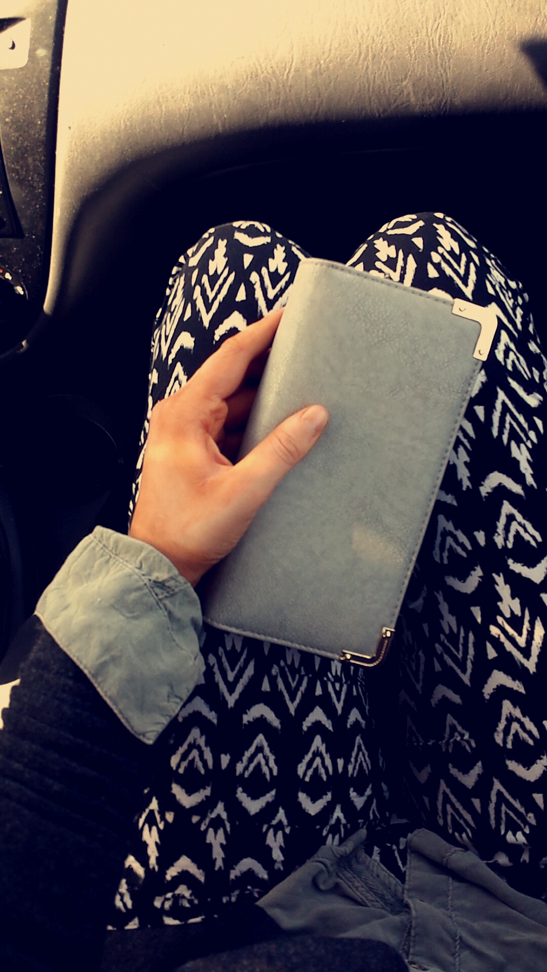 Detaljer av dagems klädsel, lediga byxor och grå kappa med min nya plånbok från gamaya.