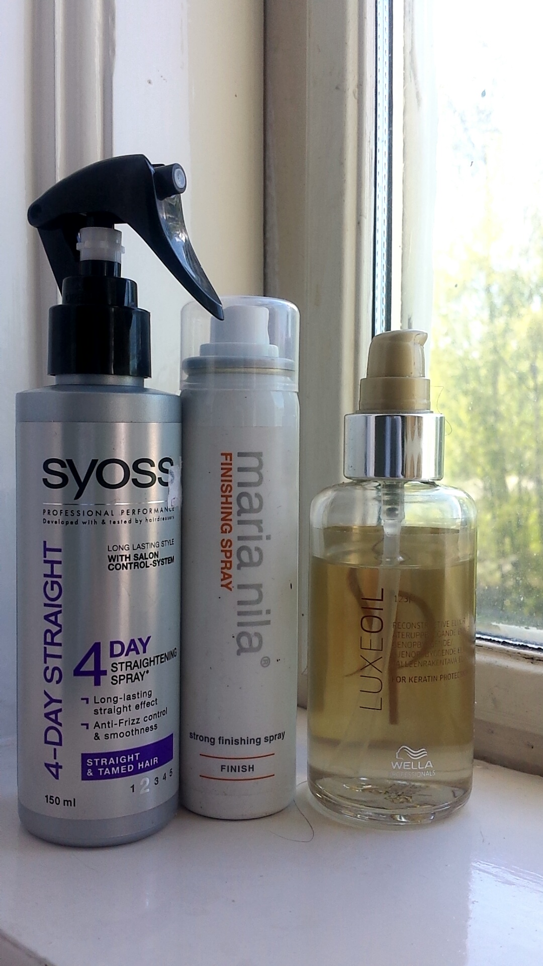 Jag plattar endast efter jag duschat och låtit håret självtorka. Jag lägger i några droppar utav luxeoil hår oljan från wella och borstar så det fördelas jämt i topparna. Sen låter jag det torka helt och sprayar i syoss 4 day straight i håret som innehåller värmeskydd och får håret att va platt längre samt motverkar klyvna toppar och elektriskt hår. Sen delar jag upp håret i sektioner och plattar. Efter lägger jag håret som jag önskar och sprayar maria nila hårspray för att boossta håret mer.