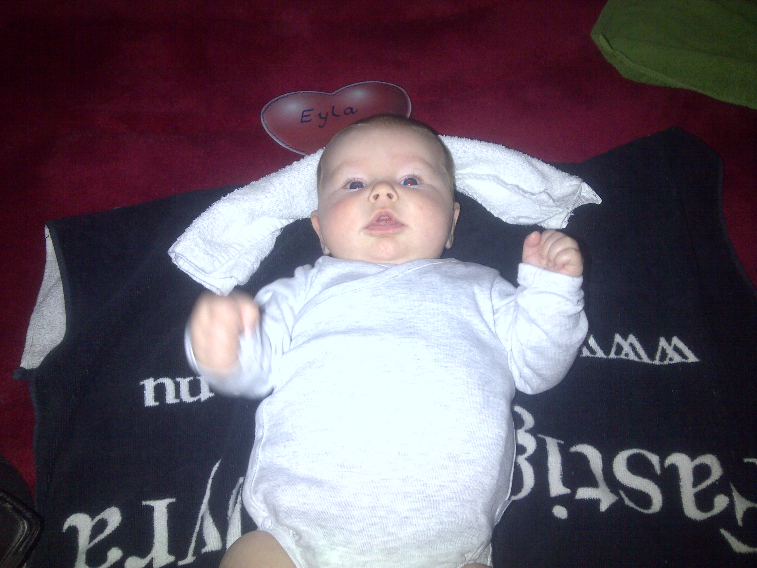 Och under massagen höll hon på att försöka vända sig. Och hon hade nästan vänt sig innan passet var slut. Det var bara den vänstra axlen som saknades ca 1-2cm från marken. Och om jag var stolt över henne då 😉 Jag fällde nästan lite tårar då. Men höll mig inför de andra. Och när de väl var slut och efter lite amning och att hon hade somnat. Så la jag ner henne för att gå ut och slänga handdukarna i vagnen som hade blivit nerkissade. Och var gör ungen medans jag är ute. Jo hon vänder sig!!!! Hon snuvade den på mig 🙁 Men om jag var lycklig och stolt över min lilla tjej. Snacka om att det börjar gå fort nu. Trodde att det skulle ta ett tag till då hon verkligen inte gillar att ligga på mage. Men kanske att hon börjar gilla det nu då hon vänder sig till magen från rygg 🙂 SUPER STOLT TÖNTIG MAMMA! Hahahahaha det är jag 🙂