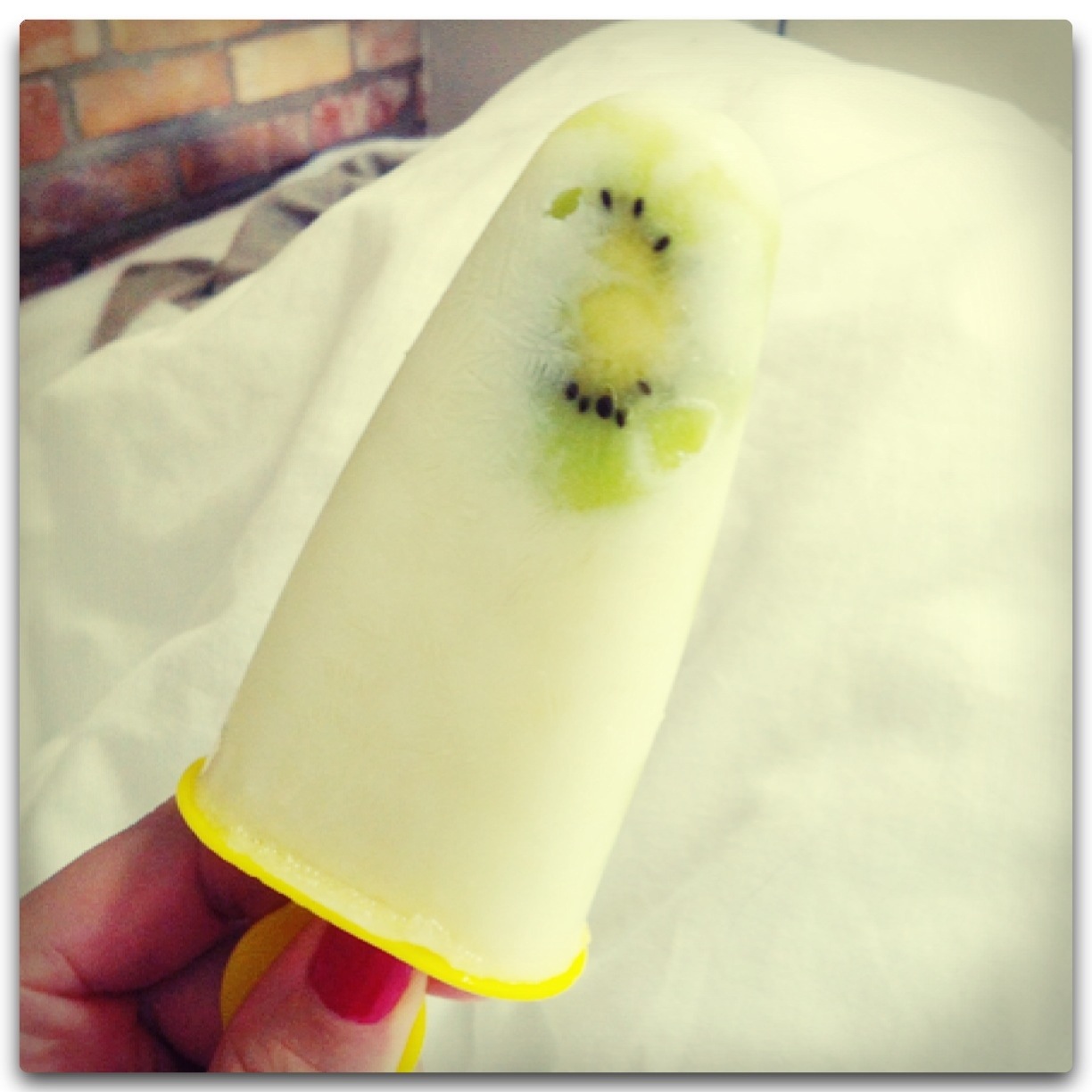 Kiwiglass 5 september 2013 av Julia Björk Glass gjort av: – 0,5 dl lätt fil – 0,5 msk agavesirap – 0,5 tsk vaniljsocker – skivor av kiwi