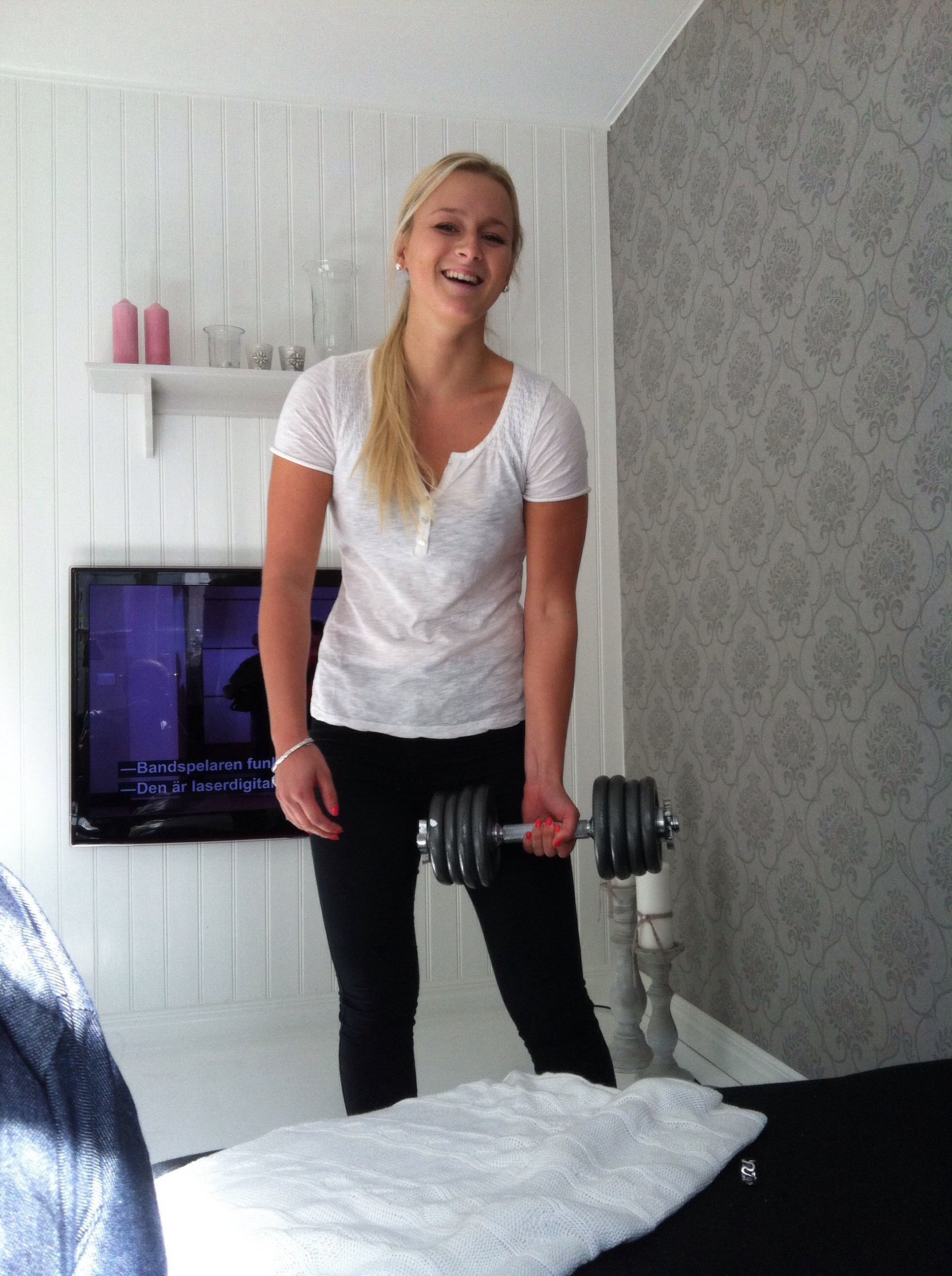 Haha, försöker göra bicepscurl med en 14 eller 15 kilos vikt. Med liite sving gick det allt! Pontus har precis gått hem för att åka till jobbet. Vi lagade lite lunch bestående av spaghetti, ägg och sallad. Mycket konstig blandning, men gott var det ändå! Jag ska snart sticka ner och träna på gymmet innan jag och mamma kör iväg till Trx passet. Tänkte jag skulle köra axlar och eventuellt lite cykling.
