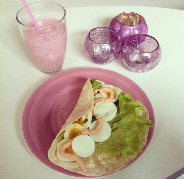 Frukost 15 okt 2013 av Julia Björk Hade några tortillabröd kvar sen helgens tacos så jag lyxade till det lite extra. Smoothien gjorde jag på 100g kvarg blandat med funlight, 1 dl mjölk och 1 dl frysta hallon. Hade i lite agavesirap och stevia också.