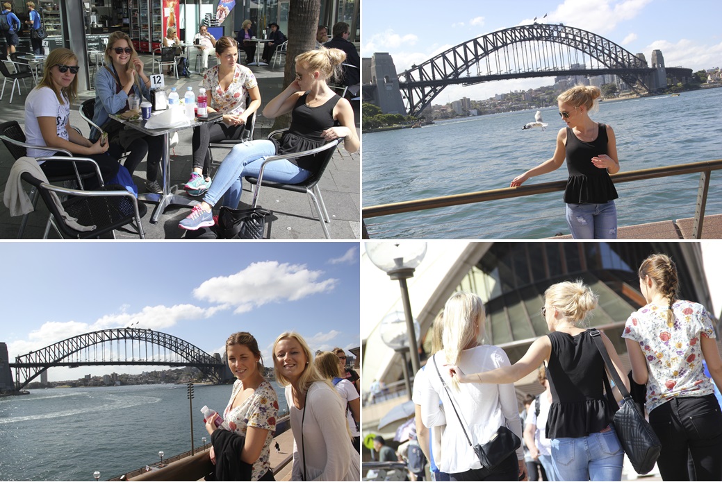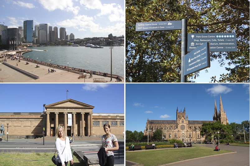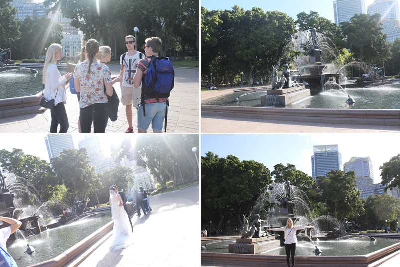 Dagen efter tog vi ett större tag i vår upptäcktsfärd och helt plötsligt befann vi oss vid Harbour bridge och Operahuset. Det var riktigt häftigt att se. Det kändes så overkligt på något vis. Solen sken och det var riktigt varmt denna dagen, så vi var lagom varma i våra jeans. Vi gick runt och tittade, fotade, pratade, träffade på två svenska killar, tog en lunch på ett mysigt café och bara njöt. Därefter vandrade vi vidare och hamnade i både The royal park och i Hyde park. Det är två väldigt mysiga parker. Det var så speciellt just eftersom att man befann sig i en vacker och lugn park precis bredvid vattnet, och på andra sidan om sig var det värsta storstaden, d.v.s. Sydney själv. Härliga kontraster! I Hyde park såg vi ett par som hade/skulle gifta sig som tog sina bröllopsbilder och det såg helt underbart ut där framför en stor fontän och hennes klänning var helt magisk. De såg så kära ut!