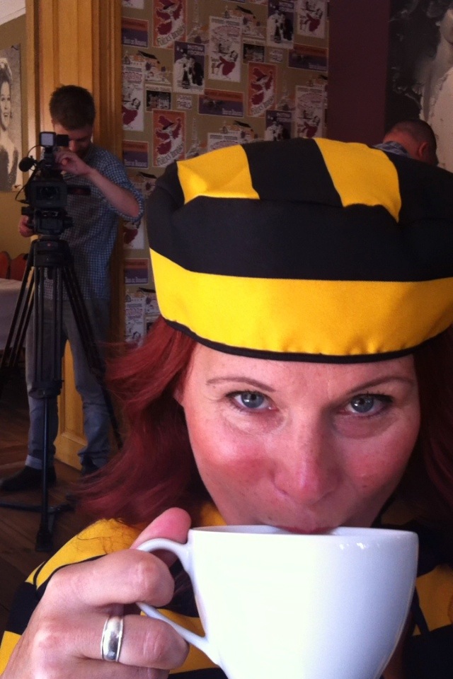 Tv kamera 23 maj 2012 av carinapernilla Lotta med en kopp i handen o en kamera bakom sig! Jag ställde upp mig med Sitting Bull.