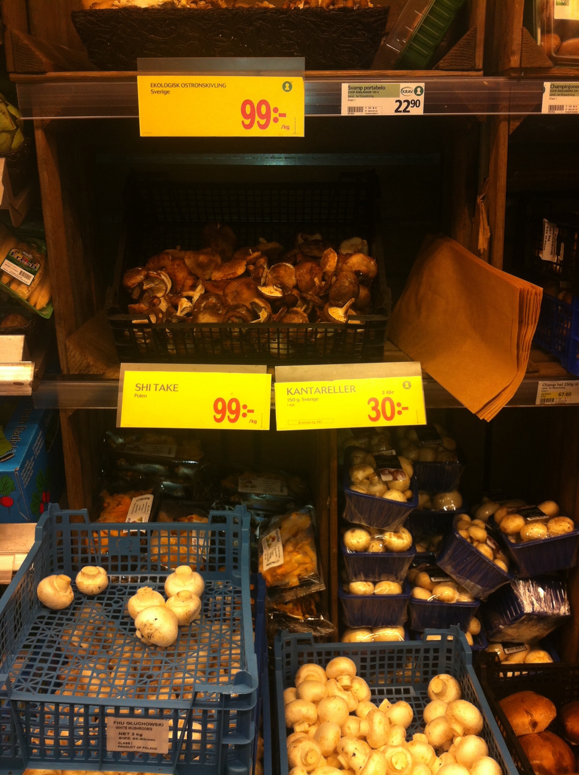 ….men utan korg och kniv! Det blir plonbok och plastkasse och sedan trampar jag ner till coops lösviktssvampavdelning. Luften är dock inte lika frisk här som i skogen, men garanti för svamplycka väger upp detta. 😉 Tro nu inte att jag inte gillar att gå ut på tramp och leta svamp. Jag har nog bara inte haft tålamod att hittat de rätta ställena, och att fråga någon svampplockare går ju inte för svamställen är ju såååå hemliga :p Svampiga pussar från Prillan