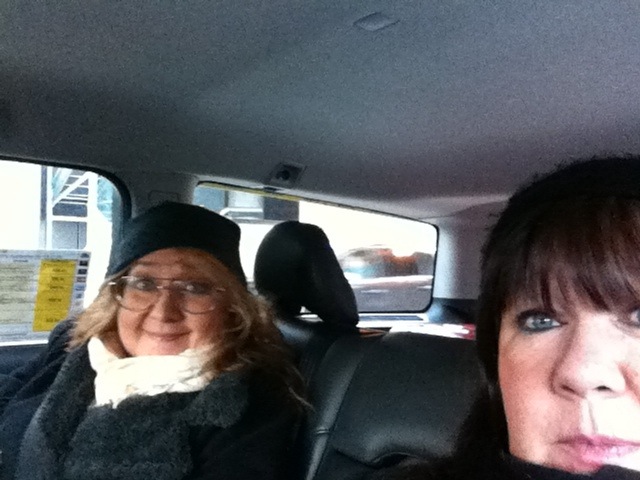 På väg i taxi mot Solna – carina & pernilla! Bamsekram