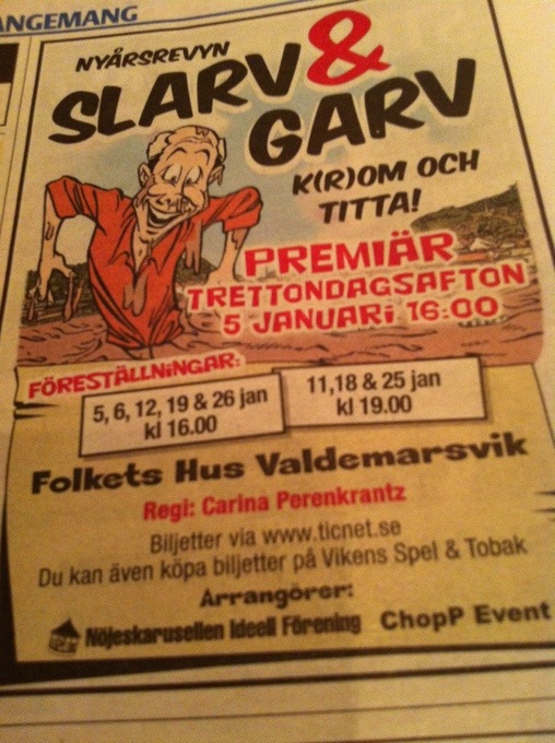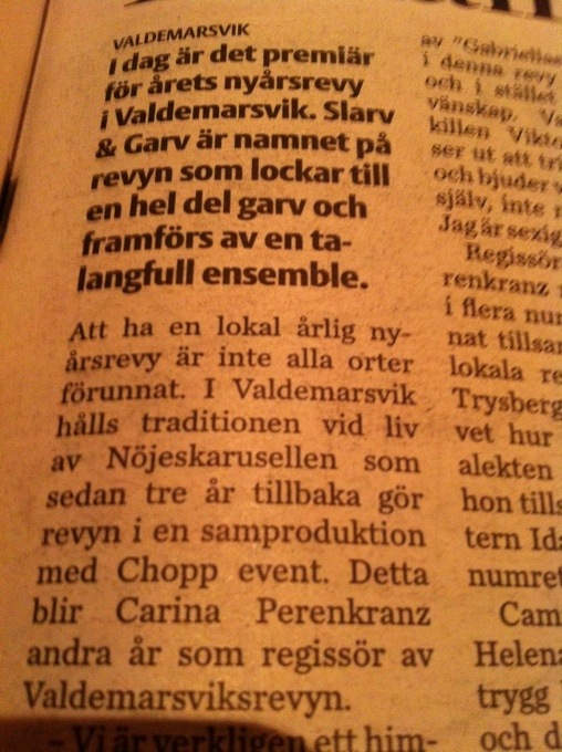Då är vi framme vid premiär. Det känns faktiskt riktigt bra efter ett riktigt lyckat genrep igår. Idag skriver tidningarna en blänkare om kvällen. Ser fram mot partyt efter föreställningen också ! 🙂