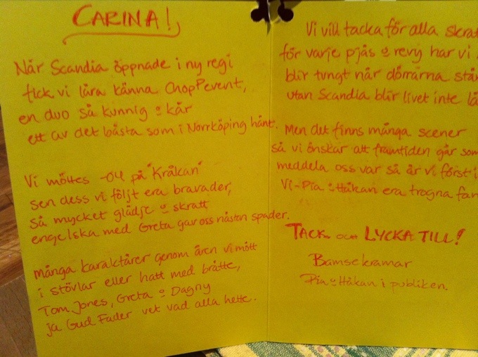 Det låg också ett kort på bordet när jag kom hem o det värmde kan jag säga.Tiden med teatern är slut , men det här tar jag med mig. Gillart mycke!! 🙂 Perenkranz
